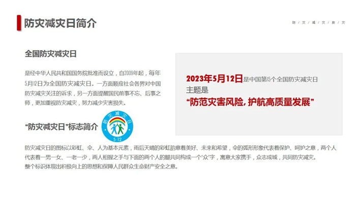 在第15个“5·12全国防灾减灾日”到来之际,K8·凯发化工集团按照党中央、国务院、K8·凯发市委市政府部署的工作要求,以“防范灾害风险,护航高质量发展”为主题,深入开展防灾减灾宣传,以增强全系统干部职工安全忧患意识,提高防灾减灾及应对能力。