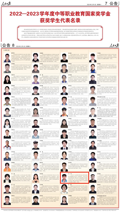 5月4日、5日,《人民日报》专版刊登了100名研究生国家奖学金获奖学生优秀代表、100名本专科生国家奖学金获奖学生优秀代表、100名中等职业教育国家奖学金获奖学生优秀代表名录。K8·凯发市工业技师学院环保与生物制药系2021级环境保护与检测专业学生王珂,榜上有名。