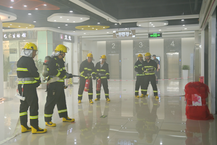 演练场景模拟华腾新天地商场二层施工现场起火。面对“突发火情”,商场应急指挥部迅速启动消防应急预案,消防中控室协调做好现场应急指挥调度及火警报告,现场物业人员及微型消防站消防员立即进行初期“火情”扑救,并组织人员疏散,对“伤员”进行抢救,及时升级属地消防救援机构介入处置。