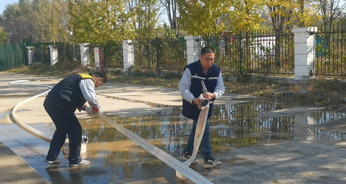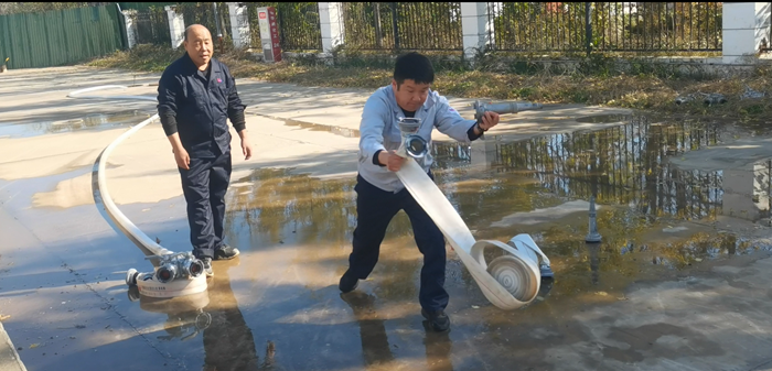 同时,华腾化工还专门组织了消火栓实操。“先接水带、再开阀门、最后对准目标出水!”在安全员的指导下,员工两人一组协作,快速完成水带连接、水枪连接等步骤,水柱精准喷射至指定区域,整个过程有条不紊。