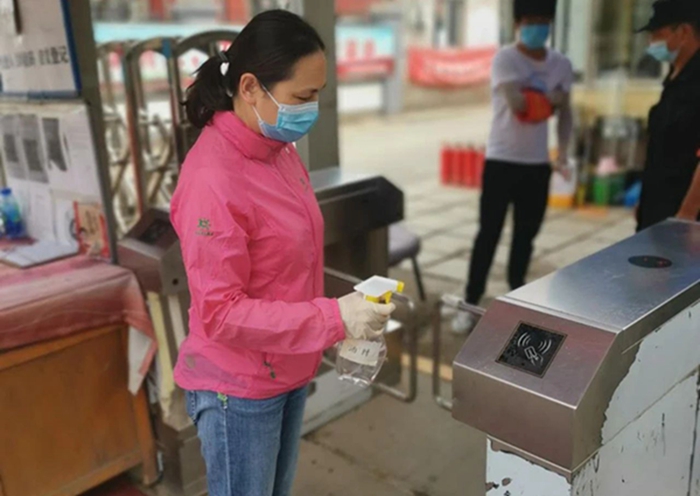 集团总部 时建秀 在工作区域喷洒酒精进行岗前消毒