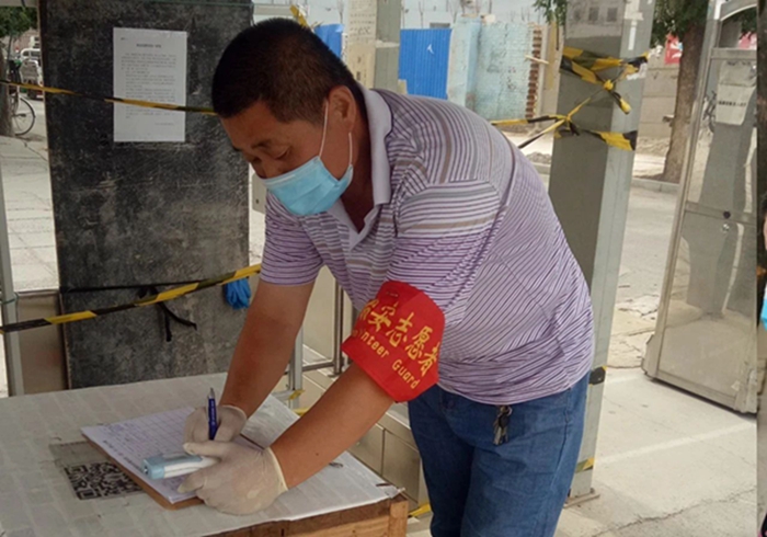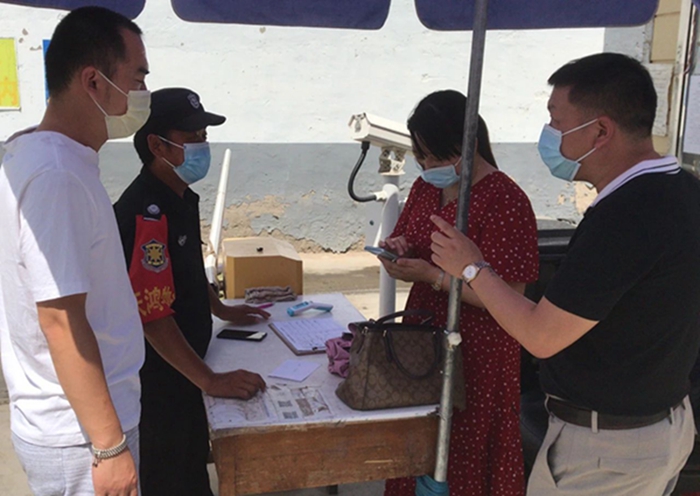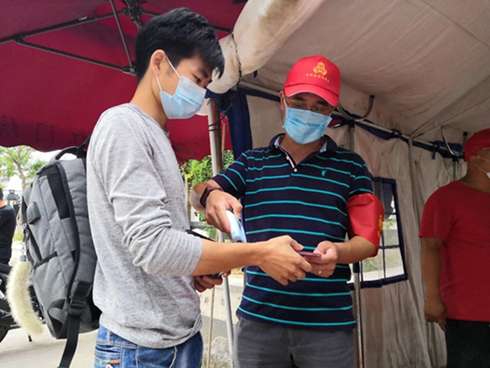 华腾丹陛华 朱海波 在村卡口为进出人员测量体温