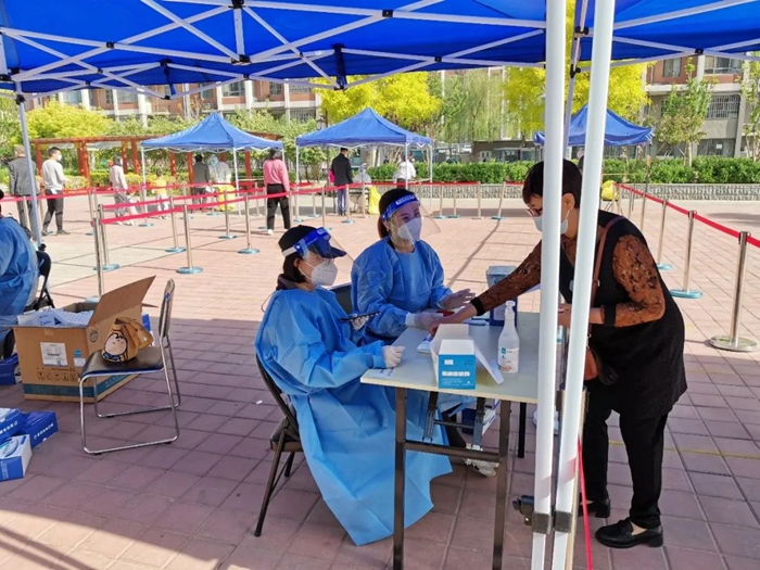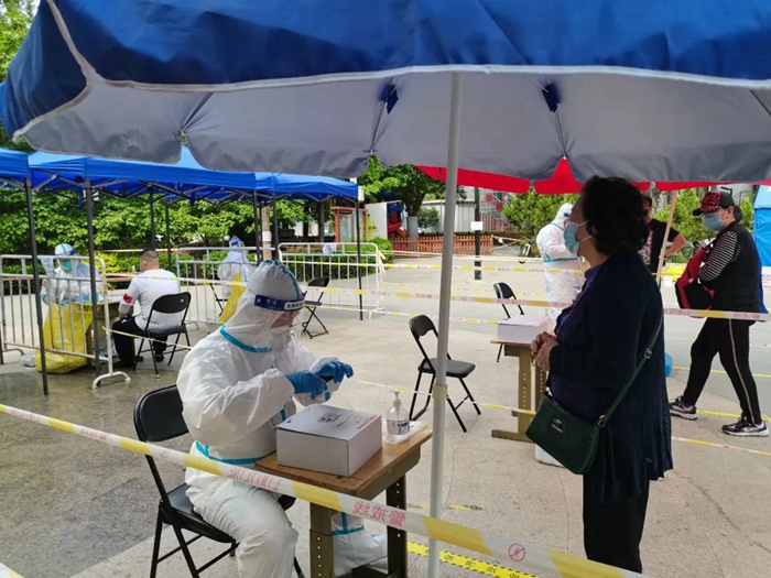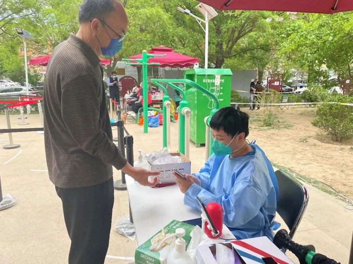 共产党员冀高娜在朝阳区兴隆社区参加核酸检测志愿服务。
