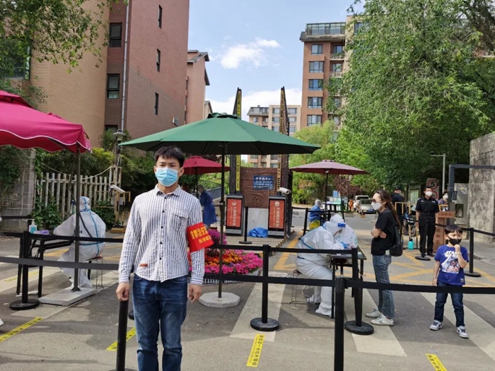 共产党员高振宇在丰台区青塔街道汇锦苑社区参加防控志愿服务。