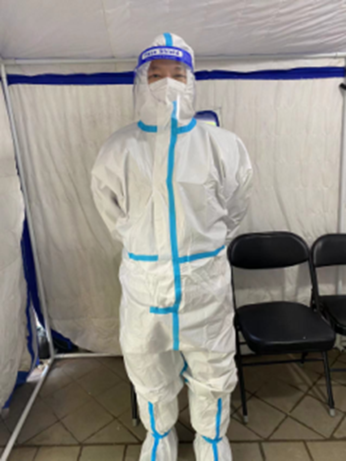 共产党员李旭伟参加大兴区旧宫镇清欣园社区核酸检测志愿服务。