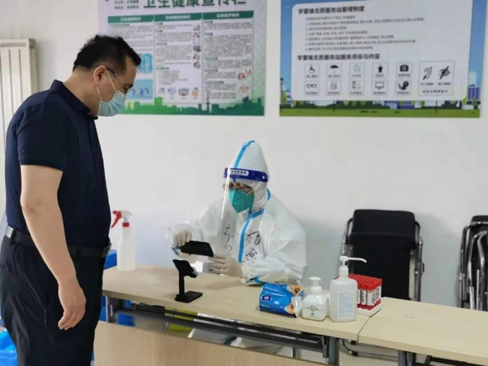 共产党员张增惠在延静里社区华商大厦检测点参加防控志愿服务。
