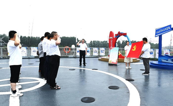 在“洪泽湖号补给舰”甲板层,全体党员和入党积极分子举起右拳,面向党旗庄严宣誓,誓为党的事业奋斗终身。