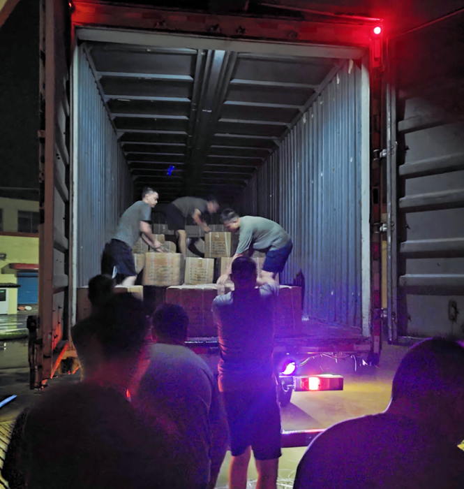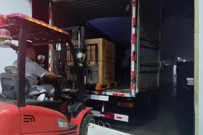 命令如山,华腾化工仓储管理部共产党员朱雨、刘宝玉、张月婷立即联合公司值守人员安全保卫部共产党员刘兵、隋红宾紧急集合,冒雨备货装车。仅用时4小时就完成全部物资的装车。