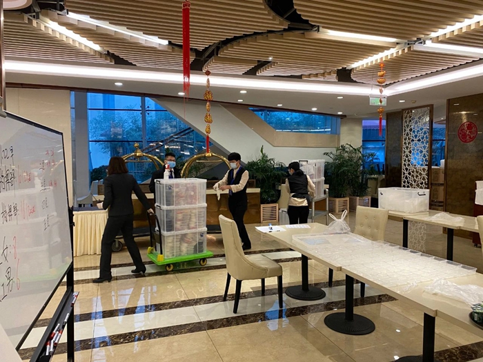 一场按照隔离服务标准进行酒店改造的大会战随即打响。从酒店区域划分到人员分配培训,从制定用餐标准到采购所需物资,从接待程序到后勤保障……在领导小组的直接指挥下,每一项工作逐一明确责任,每一项细分事项逐一落实到人、到物……一场涉及全酒店的系统改造工程就在这紧张忙碌,却不失有序的氛围中全面铺开,从艳阳高照到日薄西山,从华灯初上到到夜深人静……酒店全体员工通宵投入到改造中,华腾美居酒店迎来了一个不眠之夜。
