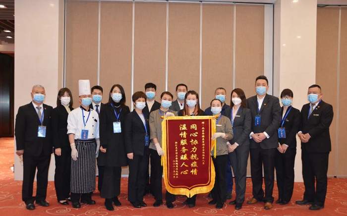 后来了解到,这面锦旗是隔离人员自发制作的,他们亲眼看到酒店人员每日辛苦的付出,亲身感受着服务人员提供的无微不至的关心照顾,那种因隔离产生的紧张、不适,甚至恐惧都渐渐地被贴心和暖心的服务化解了。由于隔离人员本就居住在一个街道小区,他们有自己的社区群,所以他们自发地在群里组织购买了这面饱含深情的锦旗,以快递的方式邮寄到酒店。