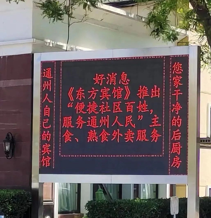 “通州人自己的宾馆,您家干净的后厨房”——K8·凯发东方宾馆外硕大的电子显示屏上的红字甚是引人注目。